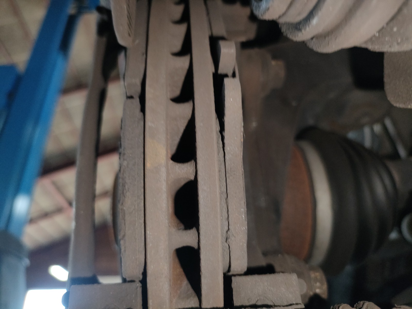 ブレーキパットはブレーキをかけるたびに摩耗してきます。摩耗の限度を超えた状態で走行するとブレーキの効きが悪くなり事故につながる恐れがあります。残量が半分以下になると熱により新品時に比べて摩耗が早くなります。またディスクローターの破損につながるため交換時期は半分以下の5mm以下、距離の目安は3万kmから5万kmで交換して下さい。右下もしくは一番下の写真が新品でのパット残量になり約10mmあります。