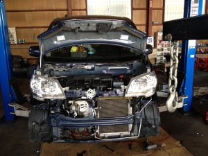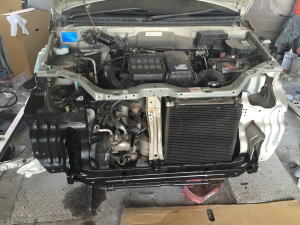 運転席のフェンダーからインサイドパネルにかけて事故修理。フェンダー・右ヘッドライト・右バンパーは交換で骨格を修理してその後、取り付けしてツートンで塗装して完成です